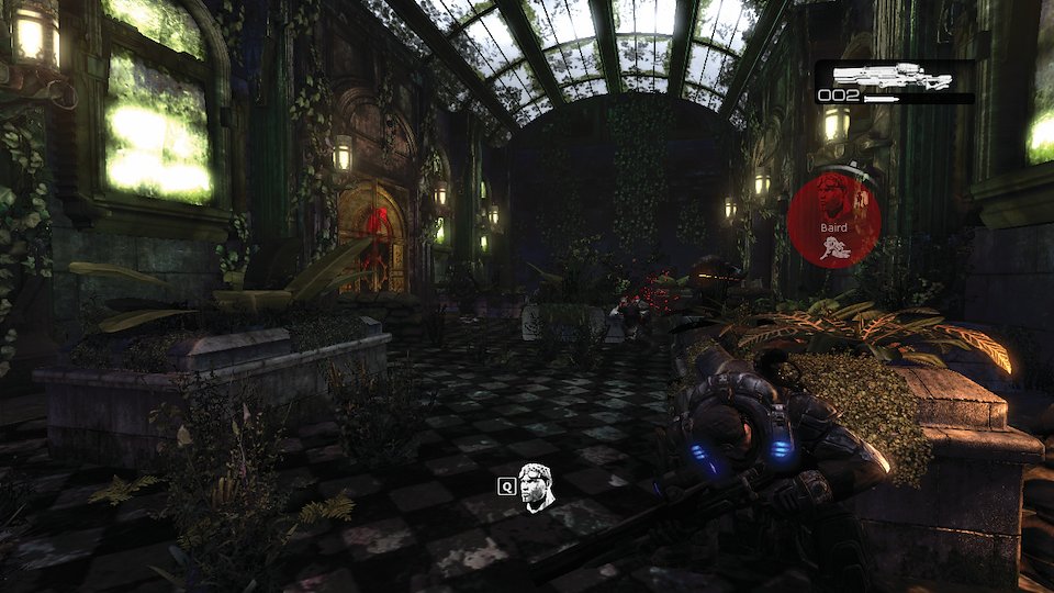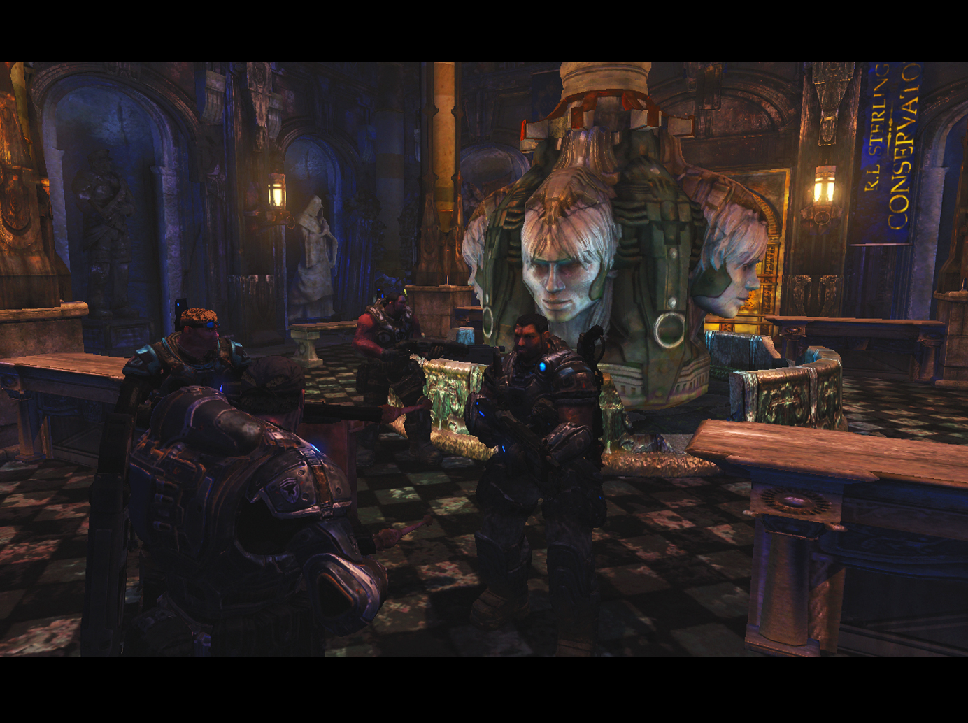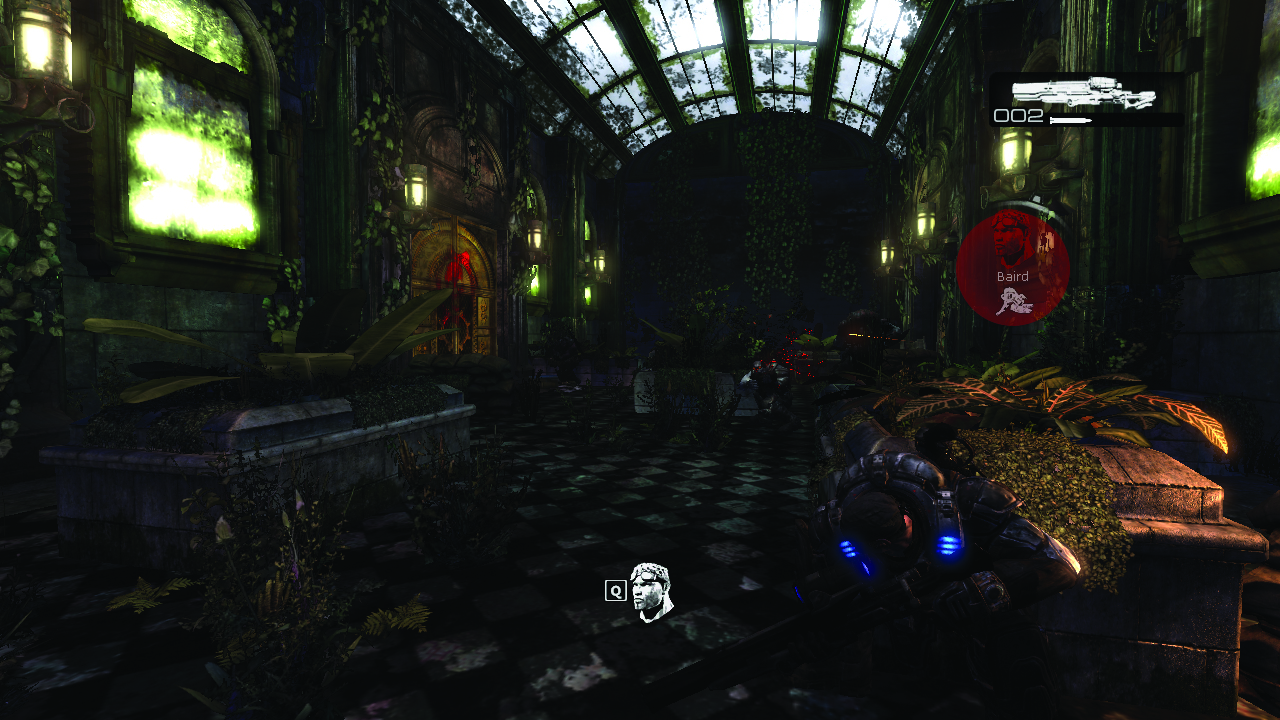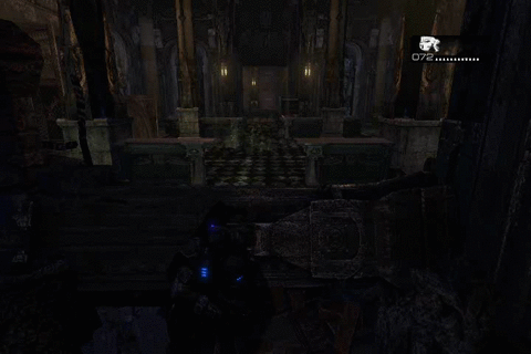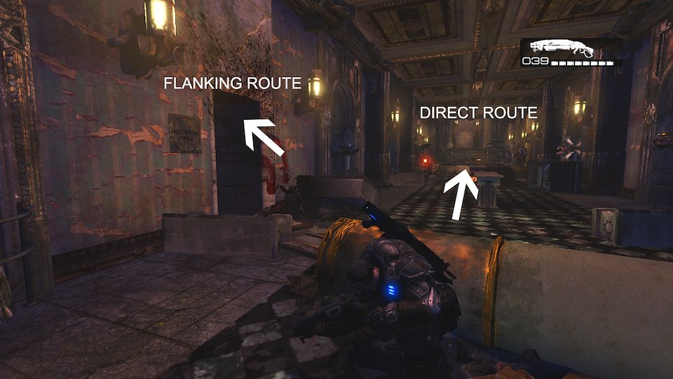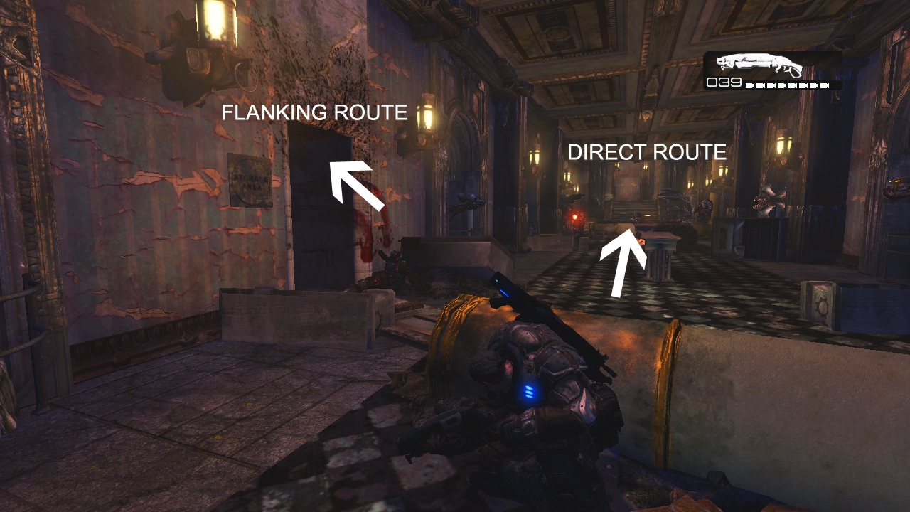 I provide multiple paths for players to take during combat. In this room, players can rush forward, taking the Locust directly, or take the flanking route for a sneakier approach. Dom will always choose the opposite route to insure that the Locust are always flanked.