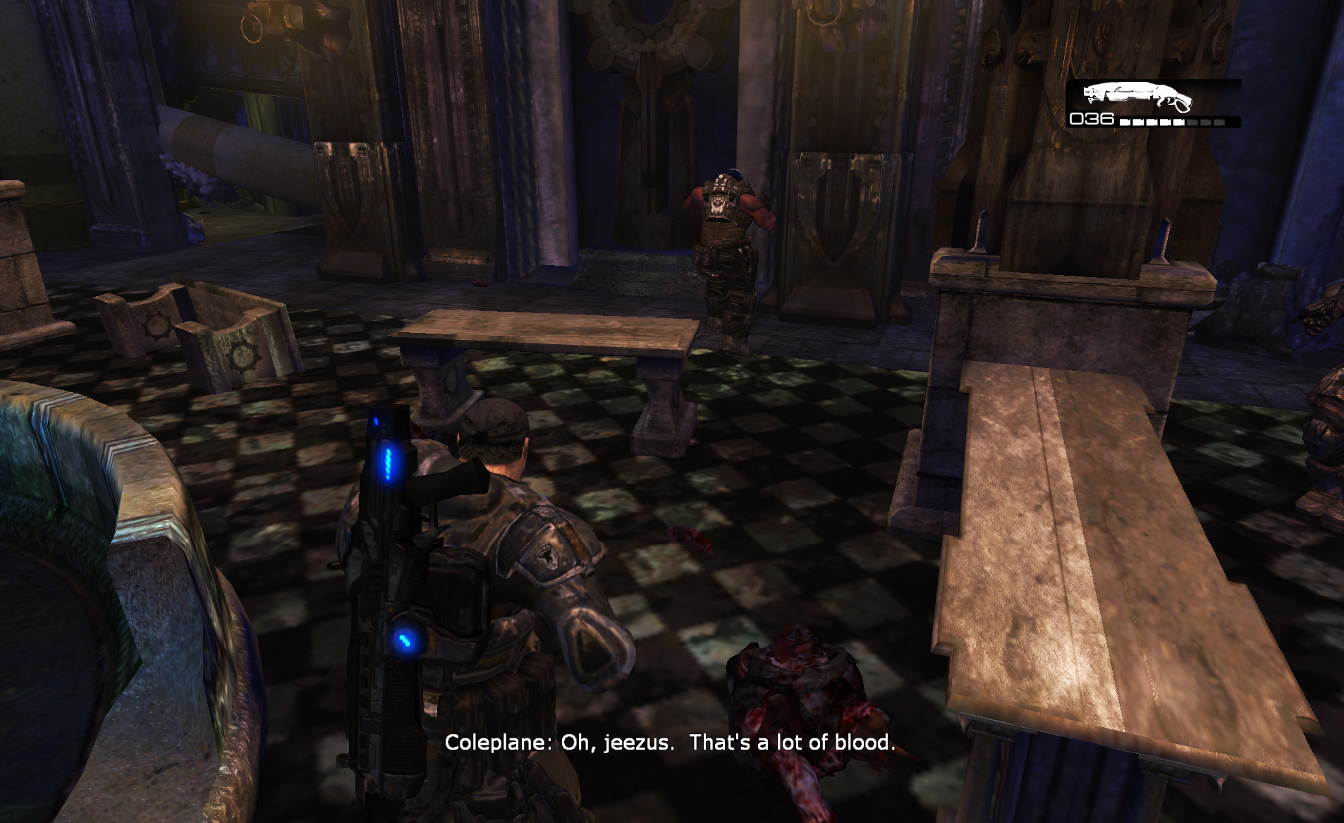 During the cooldown moments, Coleplane will walk around the environment and spout backstory about himself, the level, and the Gears of War universe.