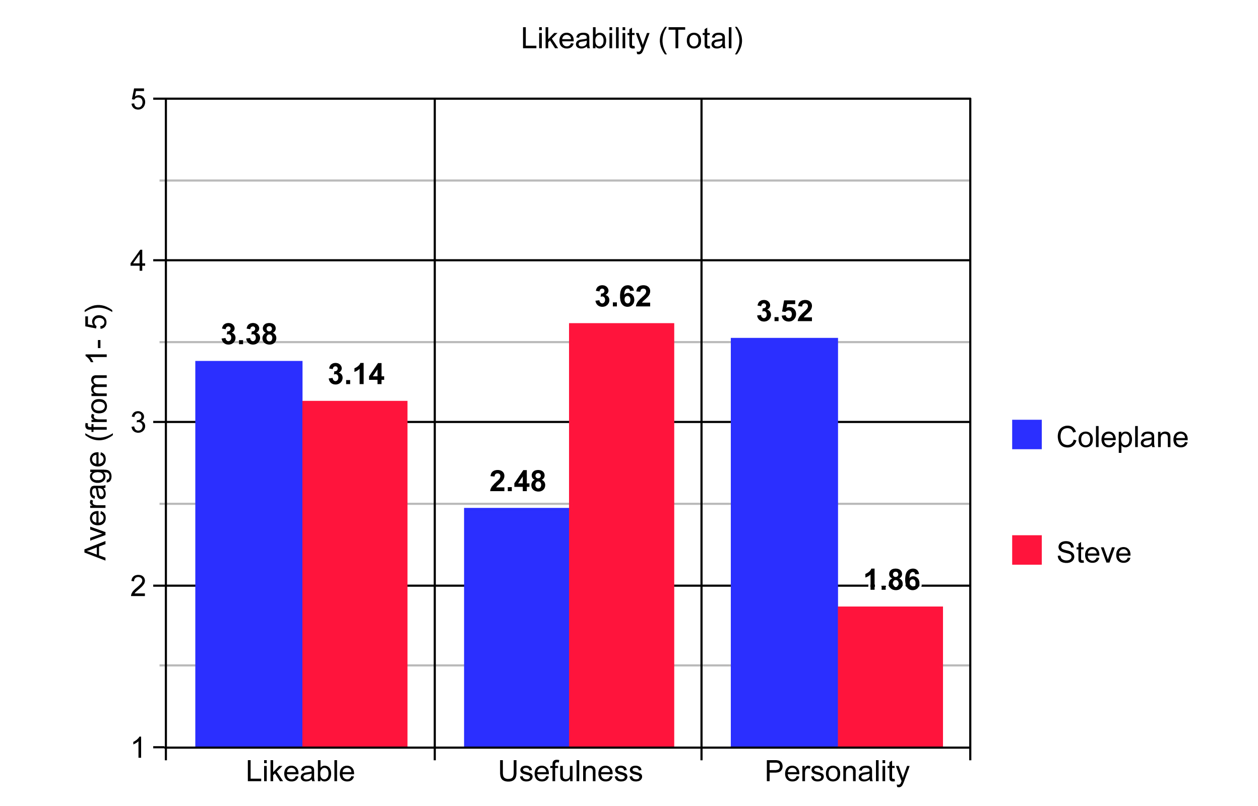 Amongst the total testers, Coleplane and Steve had a very similar Likeablity score and most testers easily identified that Steve was useful and Coleplane had more personality. But I suspected that something was odd with Coleplane's high Useful score.