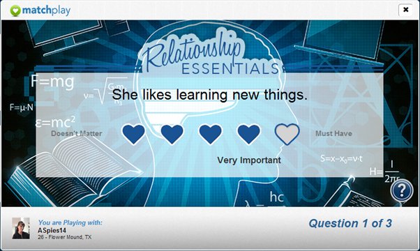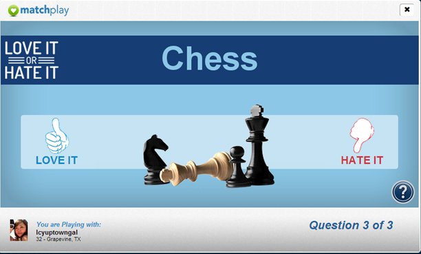 Match.com Project: MatchPlayCompletion Date: August 2014GoalOverviewMy RollBelow are examples of features and games I worked on that have been tested amongst Match.com users. |