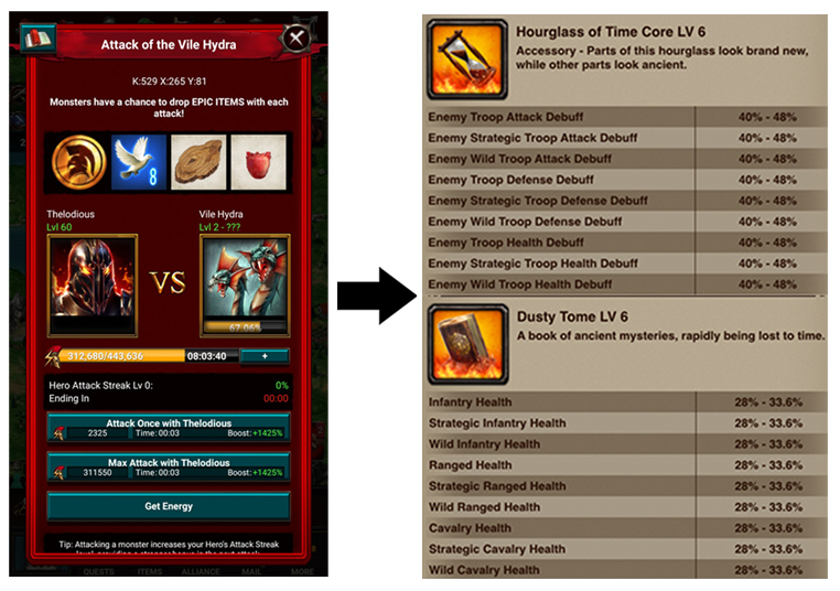 One of Game of War’s biggest retention features are Player Vs. Environment Events or PVEs. PVEs pit players against roaming monsters that drop exclusive gear. Primarily in charge of PVEs, I worked with the art team to create the new monsters, developing tools to speed up PVE creation, and created the stats for new gear every week.